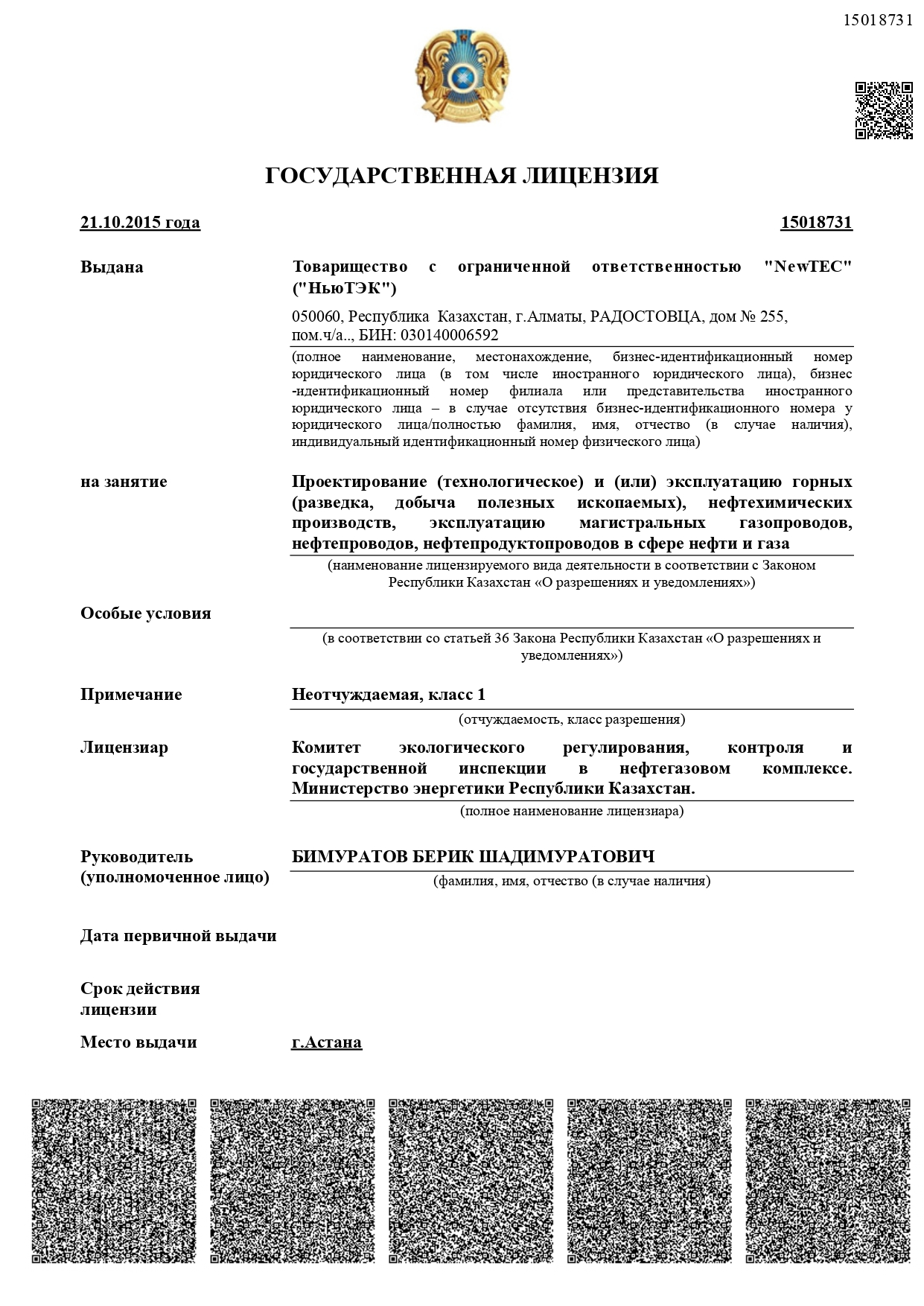 - Лицензии: на проектирование горных производств; природоохранное проектирование и нормирование; проектную деятельность. Аттестат на право проведения работ в области обеспечения промышленной безопасности. ПО проектирования скважин Paradigm Sysdrill, ПК «ЭРА».